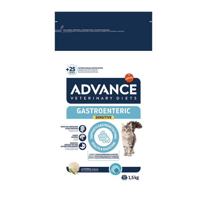 ADVANCE VETERINARY DIETS Gastroenteric Sensitive es un alimento dietético completo para gatitos a partir de 8 semanas y gatos adultos que ayuda compensar las alteraciones de la digestión en caso de trastornos gastrointestinales y de insuficiencia pancreática exocrina.
