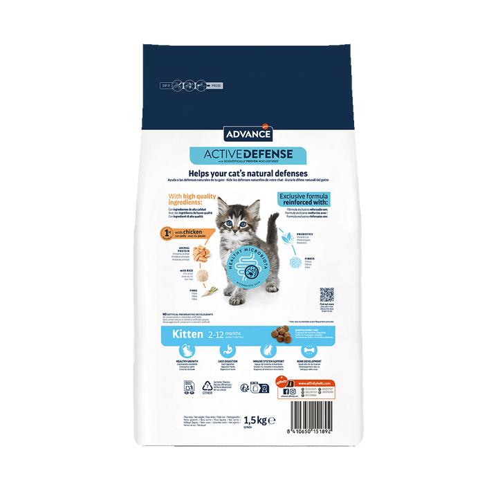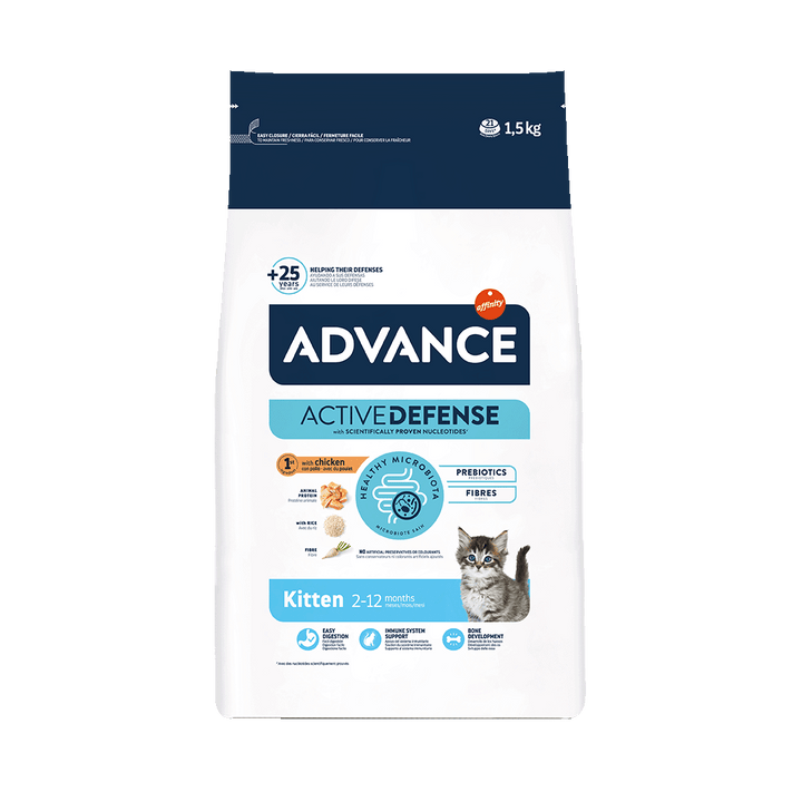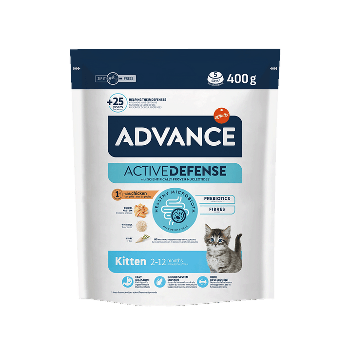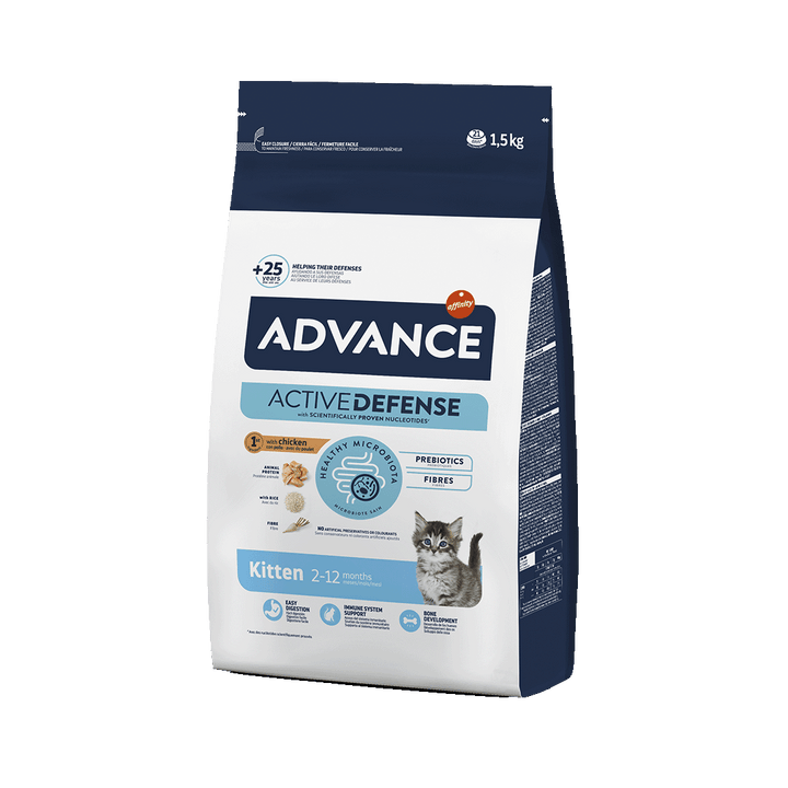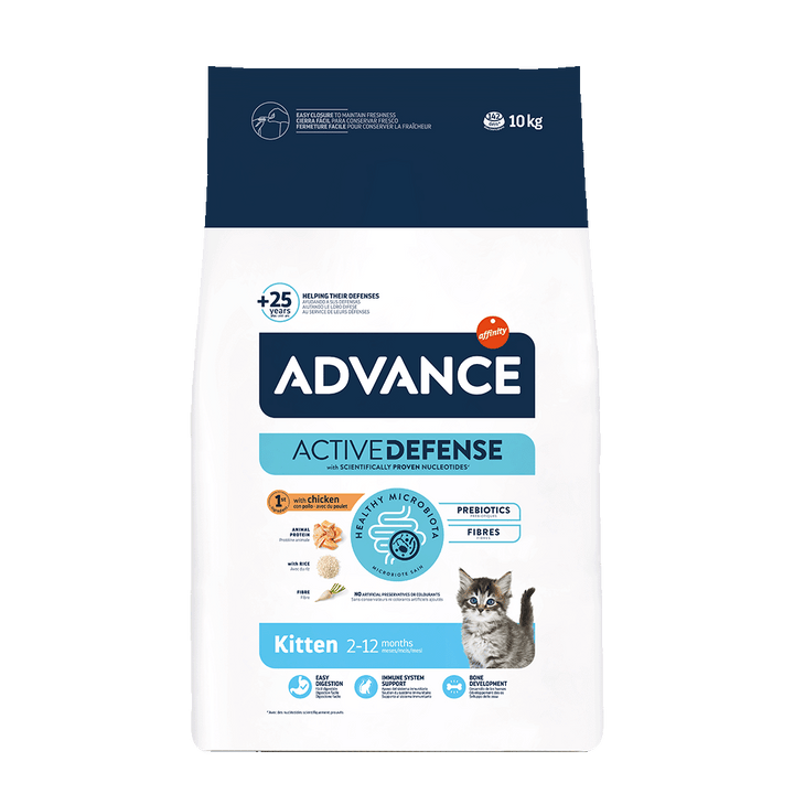 Advance Kitten está específicamente formulado para cubrir las necesidades nutricionales de los gatitos. Es un alimento fácil de digerir que contribuye al normal desarrollo del cerebro y la visión y al óptimo crecimiento de los huesos, gracias a los ácidos grasos omega-3, vitaminas y minerales. Incorpora nucleótidos que ayudan a mantener la respuesta inmunológica natural. El tamaño reducido de su croqueta se adapta a la mandíbula de los gatitos. Composición: Pollo (20%), proteínas deshidratadas de ave, arroz (16%), maíz entero, proteína de maíz, proteínas deshidratadas de cerdo, manteca de cerdo, proteínas animales hidrolizadas (ave, cerdo, pescado), proteínas deshidratadas de salmón, pulpa de remolacha (1,5%), huevo deshidratado, aceite de pescado, levadura, proteínas plasmáticas de cerdo (fuente natural de inmunoglobulinas) (0,65%), inulina de achicoria (0,4%), sustancias minerales, concentrado de levadura (fuente natural de nucleótidos) (0,08%) (https://www.advance-affinity.com/es/es/gato/comida-gato/kitten-1000382.html)