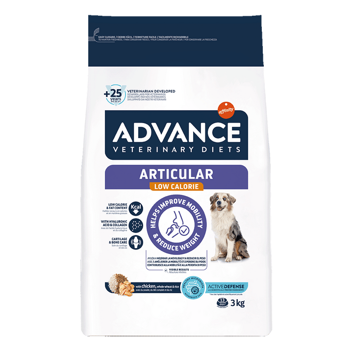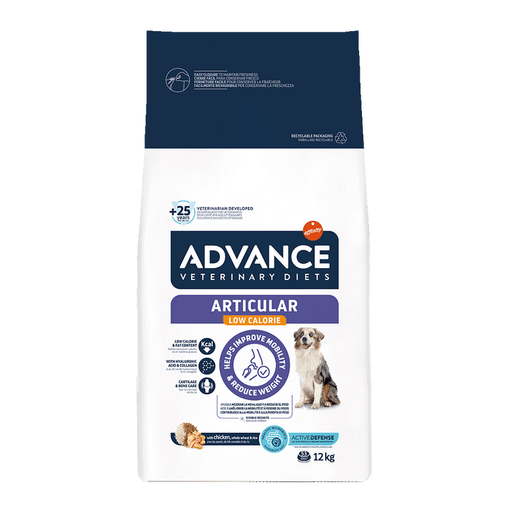 ADVANCE VETERINARY DIETS Articular Low Calorie es un alimento completo y equilibrado, formulado para la recuperación y el apoyo nutricional en el cuidado de las articulaciones en perros adultos con sobrepeso.
