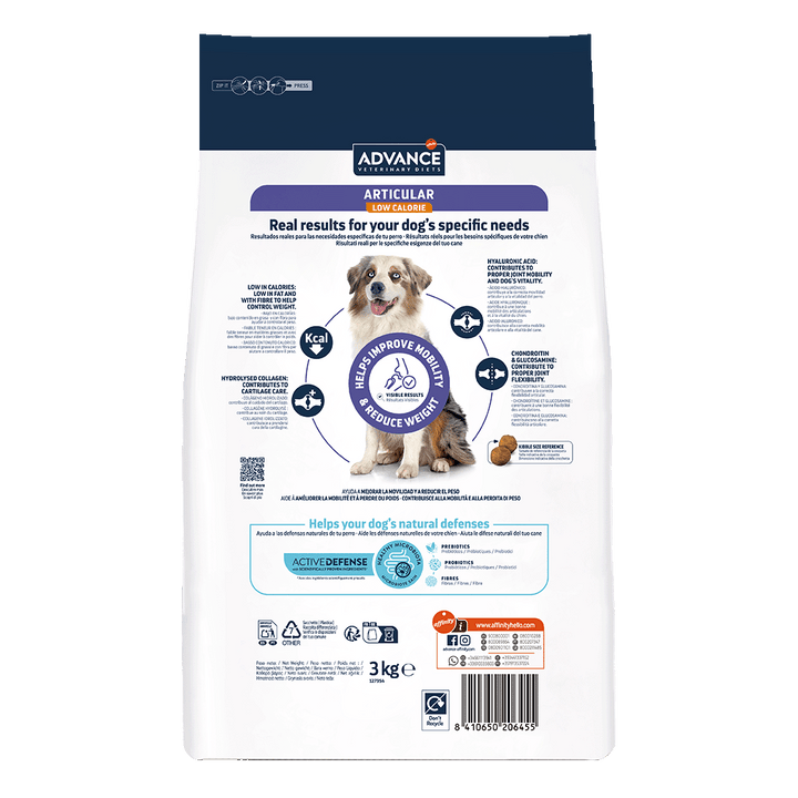 ADVANCE VETERINARY DIETS Articular Low Calorie ofrece resultados visibles: ayuda a reducir el peso y a preservar la salud y la movilidad articular gracias a su fórmula baja en calorías y a su contenido en ácido hialurónico, colágeno hidrolizado, condroitina, glucosamina y omega 3.