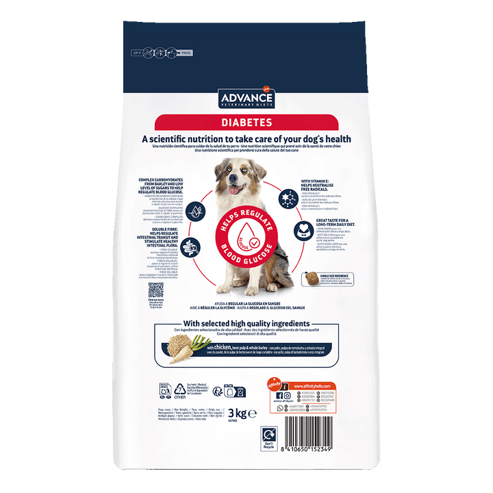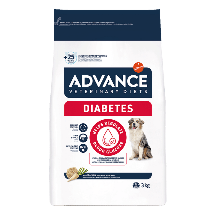 ADVANCE VETERINARY DIETS Diabetes es un alimento dietético completo para perros adultos formulado para controlar el aporte de glucosa (diabetes mellitus) y compensar la mala digestión. Proporcionando un nivel bajo de carbohidratos de liberación rápida de glucosa, ingredientes muy digestibles y un contenido bajo en grasa. Su alto contenido en fibras solubles facilita el tránsito intestinal y favorece una  microbiota intestinal saludable. Además, su fórmula baja en calorías le ayuda a controla su peso y tiene un gran sabor lo que facilita la alimentación diaria en perros con diabetes o colitis.