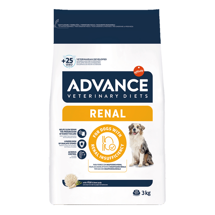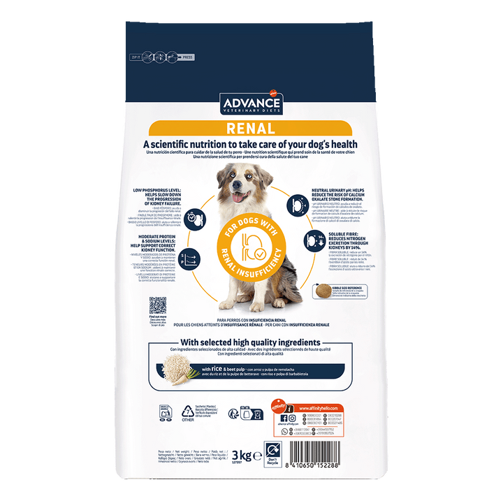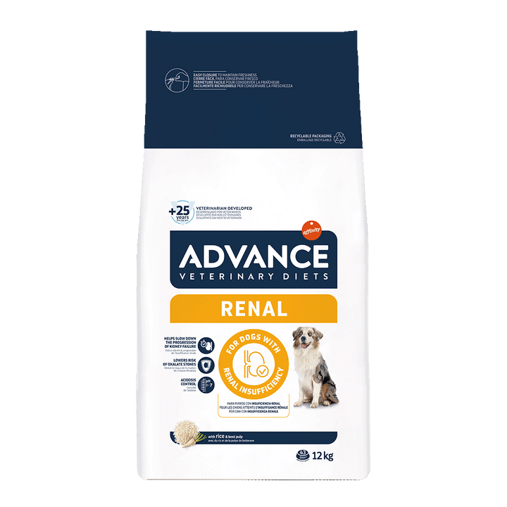 ADVANCE VETERINARY DIETS RENAL es un alimento dietético completo para perros adultos, con un nivel limitado de proteínas, pero de alta calidad y con un bajo contenido en fósforo. Está especialmente indicado para apoyar el funcionamiento del riñón en caso de insuficiencia renal crónica.