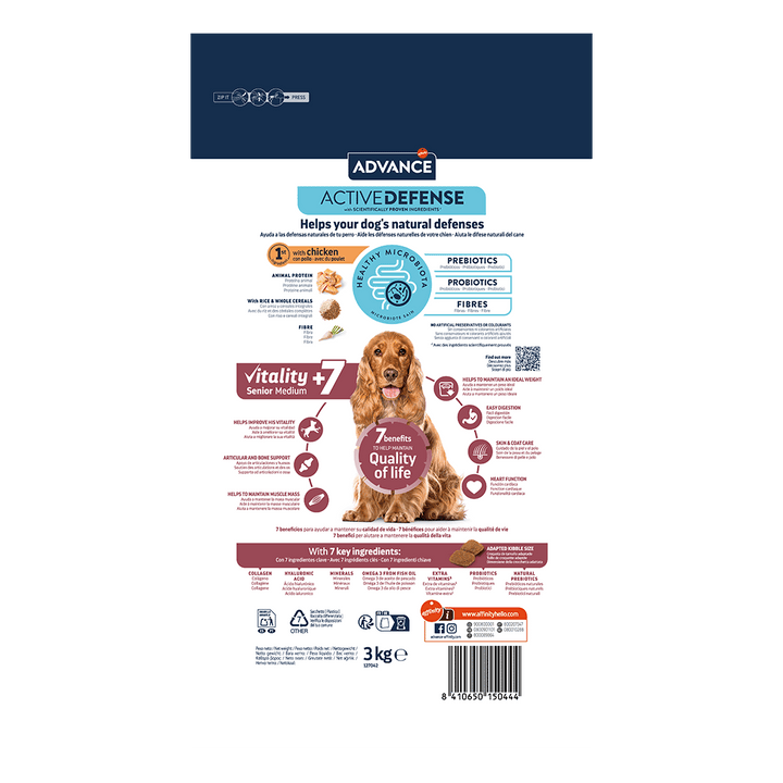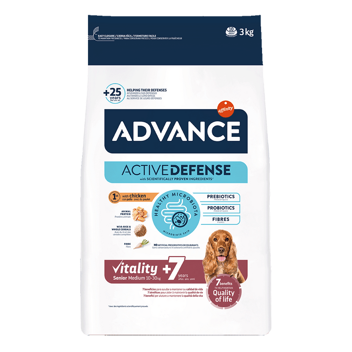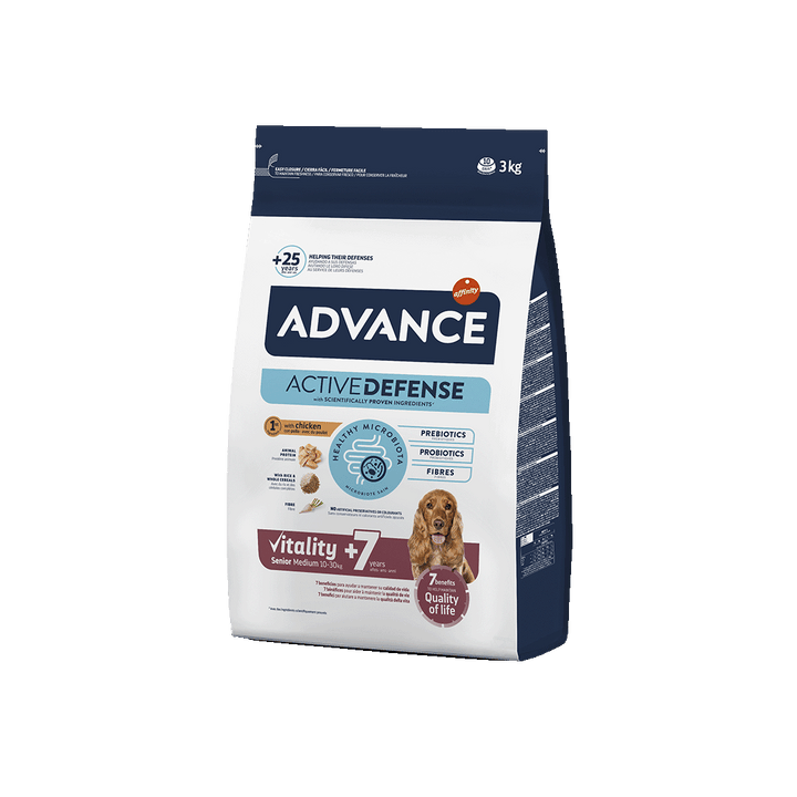 Advance Vitality Senior Medium +7 ayuda a mantener la vitalidad de los perros de tamaño mediano mayores de 7 años. Les aporta 7 beneficios clave para su edad que ayudan a mantener su calidad de vida.